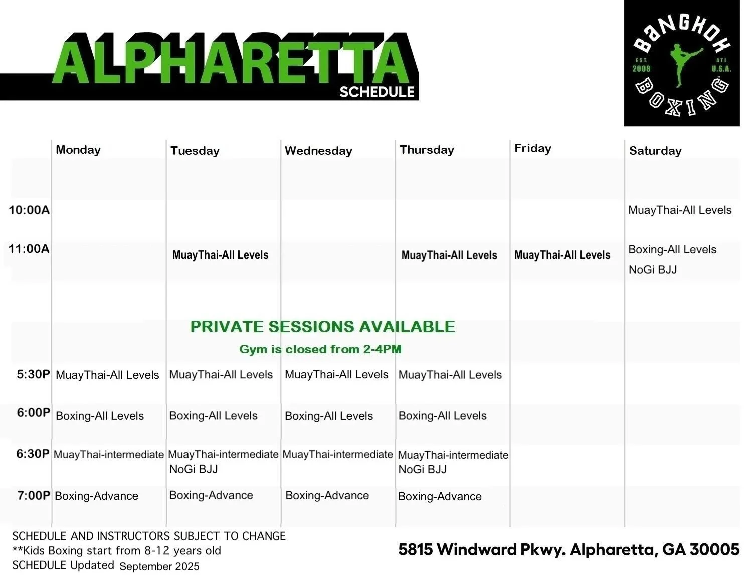 ALPHARETTA SCHEDULE View The Midtown Schedule View The Gwinnett Schedule 5815 Windward Pkwy Suit 100 Alpharetta, GA 30005 1 (678) 404-8055 Check back soon to get the most up to date schedule for the Alpharetta location.