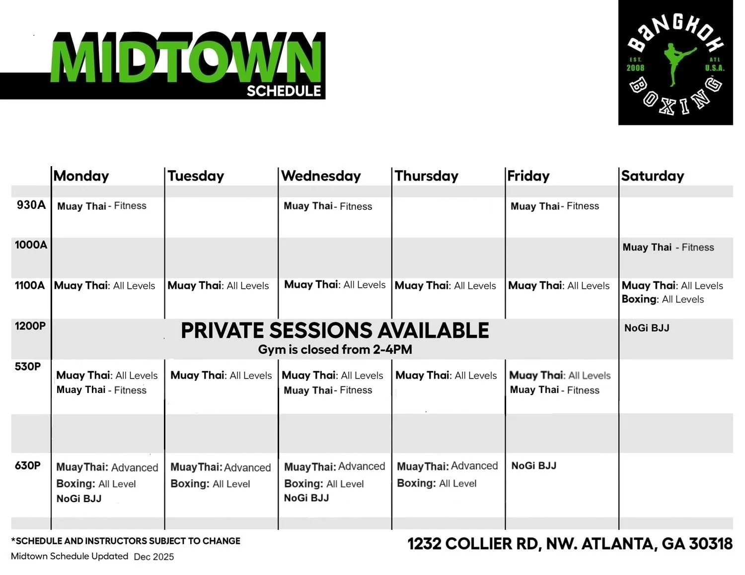 MIDTOWN SCHEDULE View Gwinnett Schedule View The Alpharetta Schedule NEAR: ATLANTA, MIDTOWN, BROOKHAVEN & BUCKHEAD